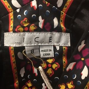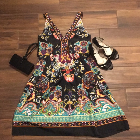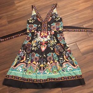 Beautiful colorful dress. V cut, ties for waist or back. Purchases two years ago but never worn.