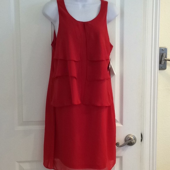 Beautiful crepe,fully lined flowing dress,layered look has button back closure,,very pretty dress brand new.