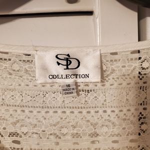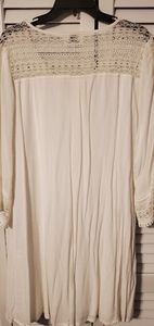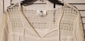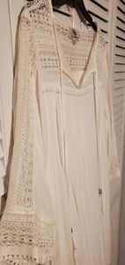 Cute hobo style gauze material. Tie neck with lace design across neckline down the arms. Sleeves are flared at bottom.