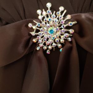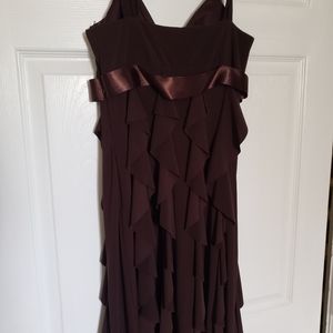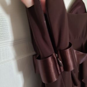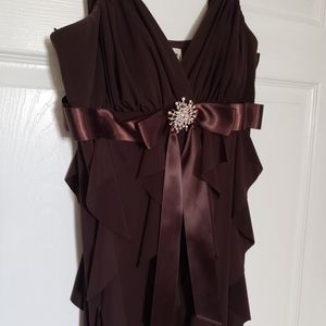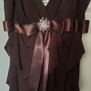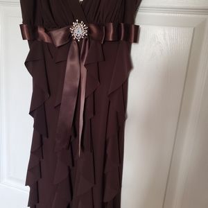 Gorgeous Brown dress size women's 8. Worn once for a wedding. Tiny fraying on the bottom of the ribbon (unfortunately received it that way) but easily fixable by cutting it horizontally with fabric scissors. See pictures. Other that it's in perfect condition. Very pretty on and beautifully flowing. Perfect for date night, dances etc. Message me with any questions. Thanks for looking and stay well.