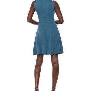 Sleeveless dress in fit-and-flare silhouette featuring subtle ruching at waist and an elegant v-neckline