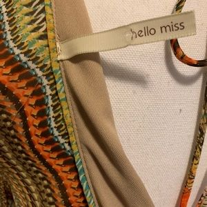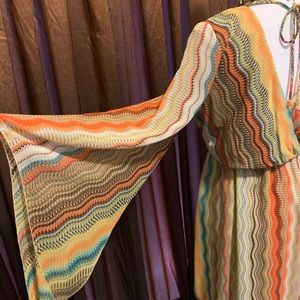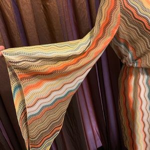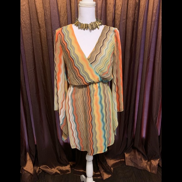Multi colored bohemian dress. Open back with tie. Fits right above the knee. Perfect for the fall.