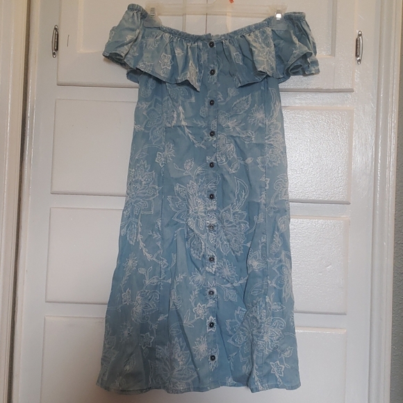 New, has not been worn. Size small, flowy shoulder dress. Sorry for the wrinkles on the dress.