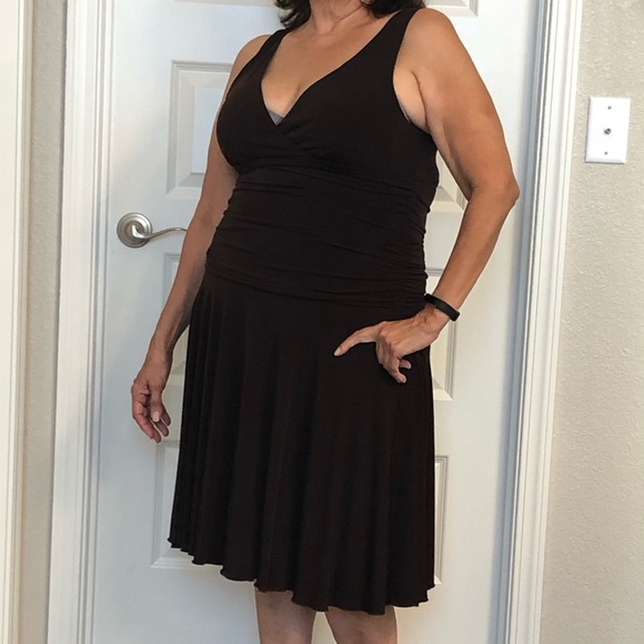 Lovely dark chocolate knit sleeveless dress with rouching and full skirt.