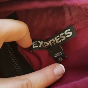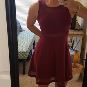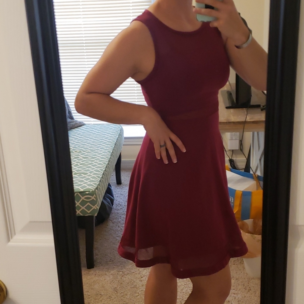 Burgundy dress with mesh midsection and mesh back. Cute symmetric cut. VERY CUTE and VERY comfortable.