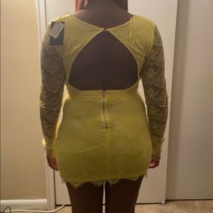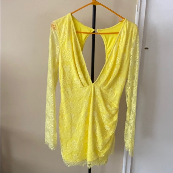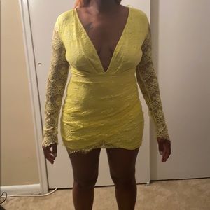 Bright Yellow Plunging Long Sleeve Lace Dress