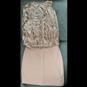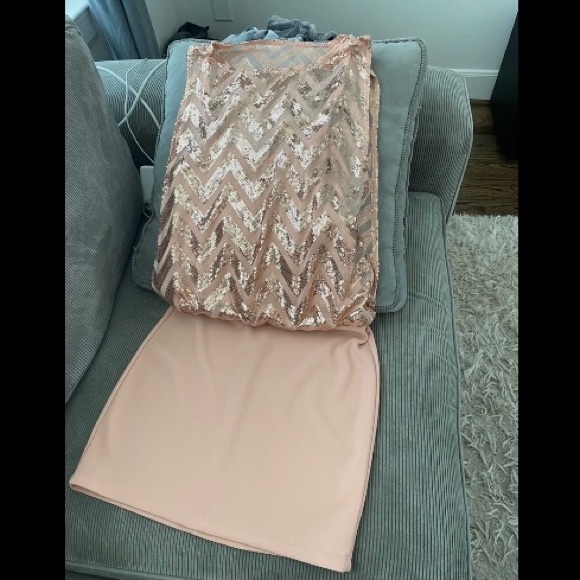 Bodycon one piece dress. Loose and sparkly upper portion, and when worn it looks like a cute loose top tucked into a tight mini skirt. Very cute. Never worn.