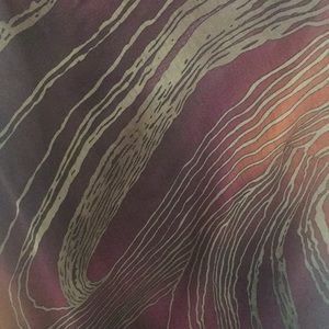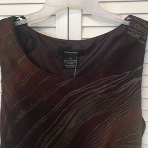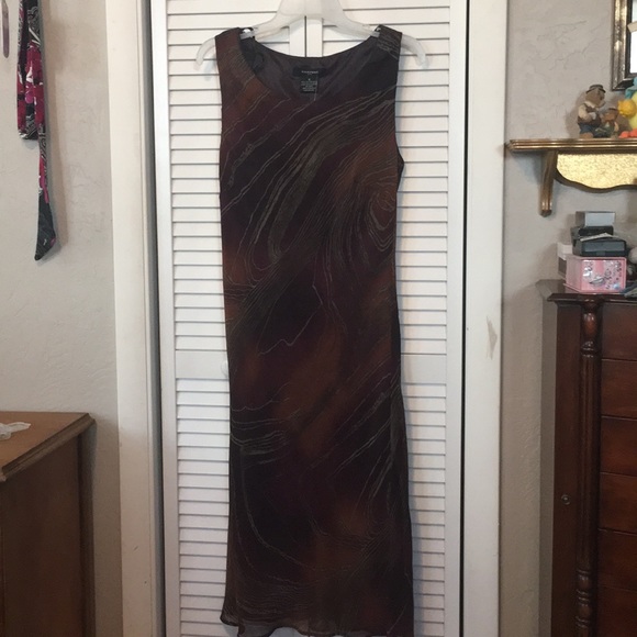 Pullover, scoop neck, sleeveless dress. Burgundy with splashes or rust and tan (looks like gold) 100% polyester, light flown fabric. Great for dinner, party or night out.