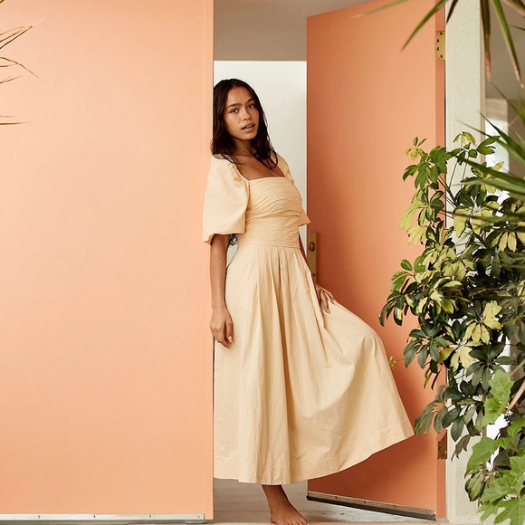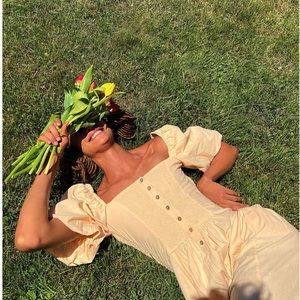 Cream colored boho dress! Sleeves can be worn on or off the shoulder! I’m 5’4 and the dress is ankle length on me. Has pockets!!