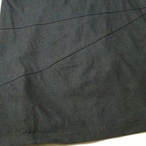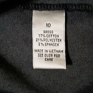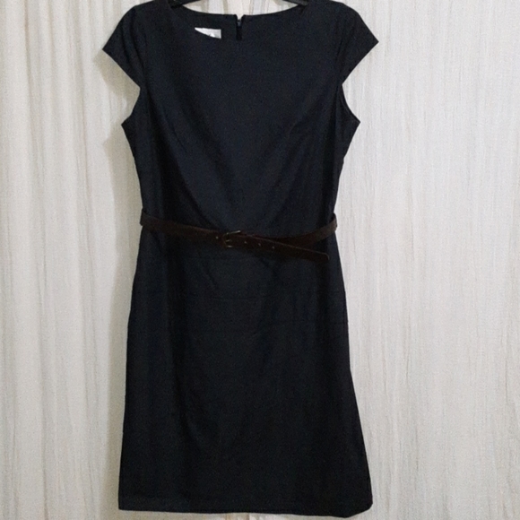 Very comfy dress, with stitching detail at the waist and mid-thigh. Fabric has just enough stretch to make it easy to move in. Neat fit with darts at the bust and fitted in the back, invisible zipper. Dark Denim blue color. Has loops for belt, but belt not included. Measurements: Across waist, 17"; armpit-pit, 19" from back neckline, 35 1/2".