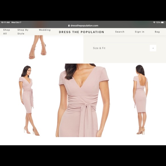 Blush in color, worn once for wedding. I had custom ties added to the inside of the shoulders so the dress can be attached to the bra strap and prevent from sliding off the shoulders. Nordstrom did the alteration. Size is medium but 8/10 is equivalent.