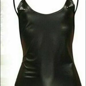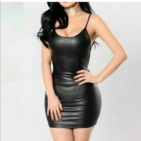 Faux leather look stretchy sexy little dress. Comes with a tiny thong. Please look at CHART for sizing as even the XL is small.