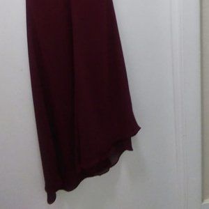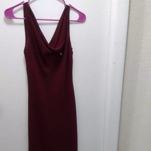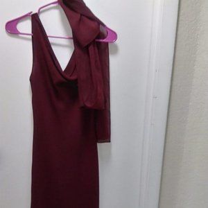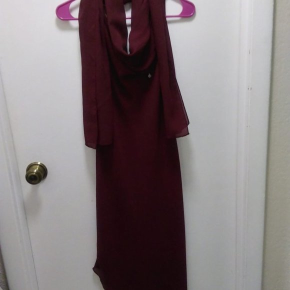 Burgundy Sleeveless dress with Cowl Neckline,V-Back and matching scarf in pristine condition, NOTNEW, No Tags! An Asymmetrical hemline which features a slimming fit.