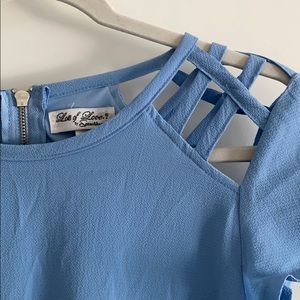 Beautiful blue short sleeved dress. I’m 5’4” and it comes down to the middle of my thighs in length. Super soft lining has a half zip in the back, very flattering and cute design on the shoulders.