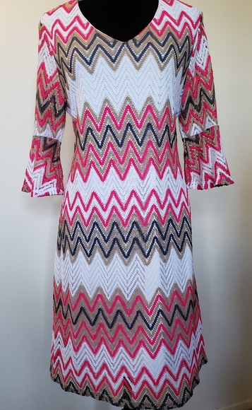 Multi colored ladies dress, 3/4 length bell sleeves. 40 inches from shoulder to hem. Nearly new, worn once.