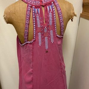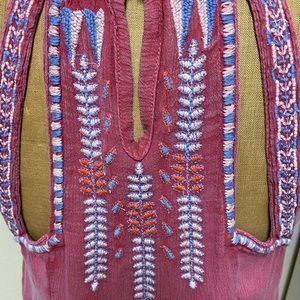 Cute detailed mini dress with pleated chest and embroidery cut out detail. Pit to pit 21 inches pit to bottom 23 inches. Two button fastener on neck and back. Keyhole back strap has embroidery detail. Flowey fit.100% machine washable VIscose. Line dry.