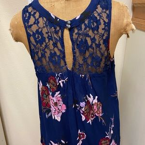 Navy background with pink, burgundy dusty rose flowers. Lace and cutwork accents around arms at front neck, lace detail on bottom, lace accent on upper back. Pit to pit 19 inches, pit to bottom 25 inches. 100% rayon hand wash.