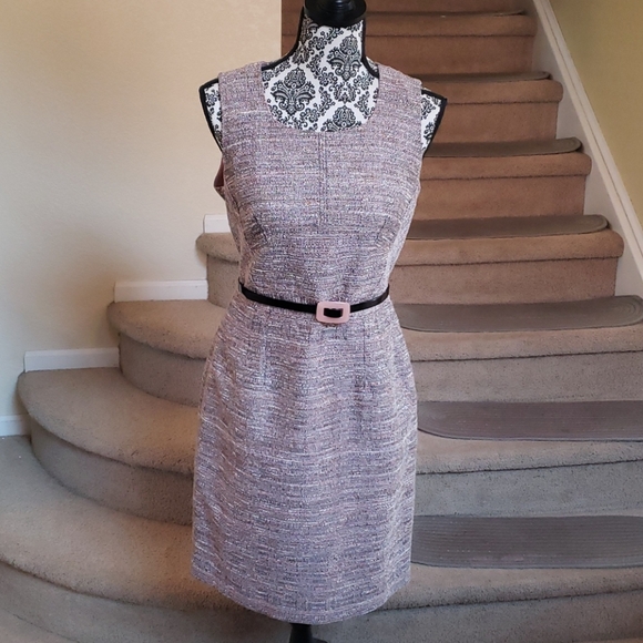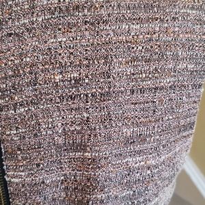 Pink, grey, black and shimmer thread interwoven throughout. Waist band with accent belt attached, visible zipper and back vent . 21 in length from natural waist with sats and lining for better fit.