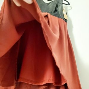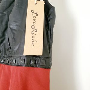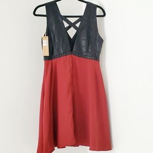 Cute A-line dress with faux leather v-cut neckline, lined with black studs. Crossed straps design over your upper back.