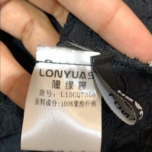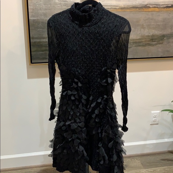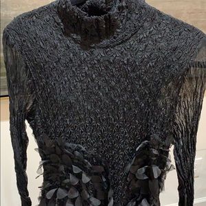 Black mock neck with sheer sleeves. Detailed application on lower 1/2. Stretch fabric