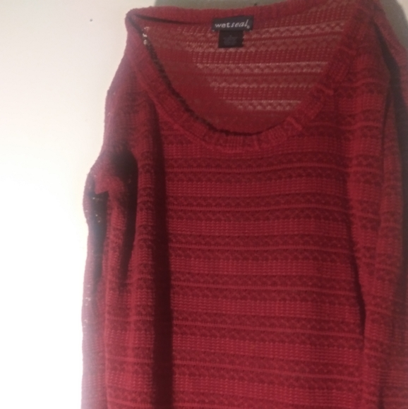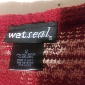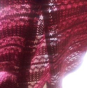 Red knitted see through sweather dress with little splits on both sides. It can be worn with a black tank top underneath and leggings.