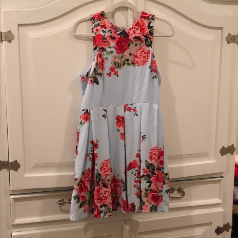 Gianni Bini pleated dress in baby blue. Has red and pink roses on it