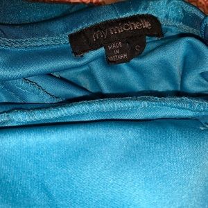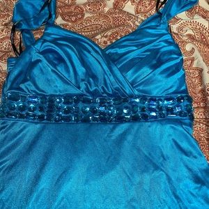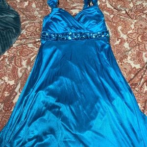 It’s a silky blue dress it has 2 spots on the front but you can rarely see them