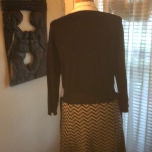 A beautiful black and cream dress with a tie belt. It’s long sleeve with a scoop neck line. it is 100% acrylic machine wash with cold water