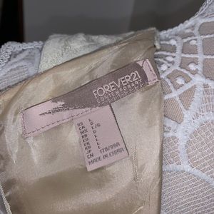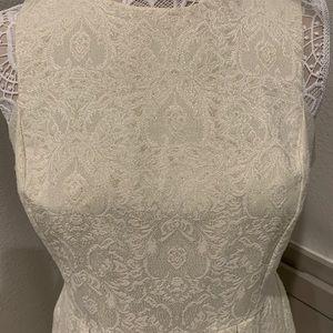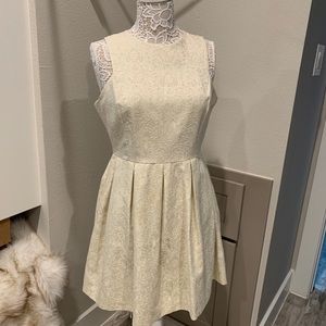 Glam dress for holidays! Super flattering in a cream and gold shimmered fabric. Sits right at the knees or above. Zippered back and lined.