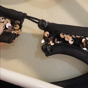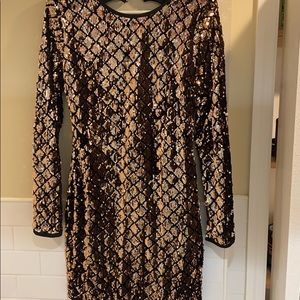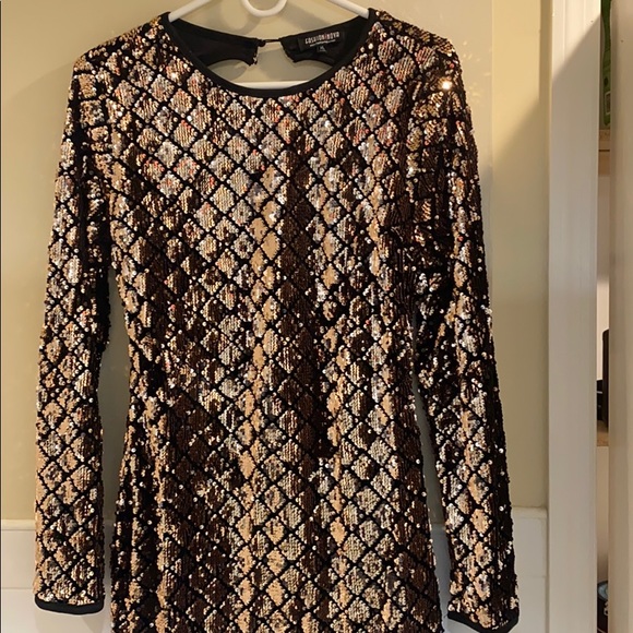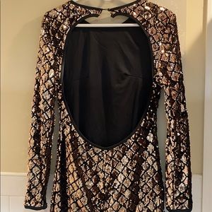 Black and gold sequence dress . Worn Once ! , from fashion nova size XL, there is some stretch in the material . Long sleeve the back is out low cut it stop lower back.( for me personally , it was fine my “area” was not out ) As seen in photo one latch hook is missing and the button is loose