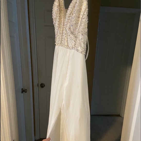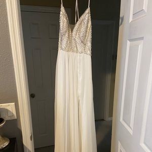 Pretty soft white dress beaded at the top, has a Open low cut back that ties with a slit for the leg on the side! Only worn once and is in great condition!