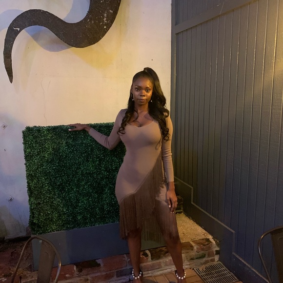 Long sleeve, v neck cut, knit, winter dress with fringe