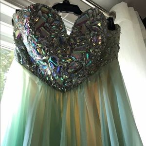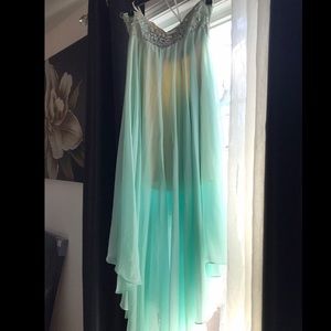 Has gems on chest and back. Its short in the front and long in the back. Very beautiful dress!