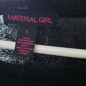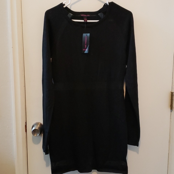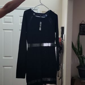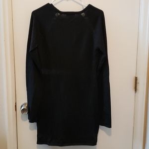 Little black dress with sheer peekaboo spots(see pic #3) at thigh, waist, & shoulders. Made of a black knit with a little sparkle throughout. Has a nice stretch to snug you in all the right areas while allowing a comfortable fit.