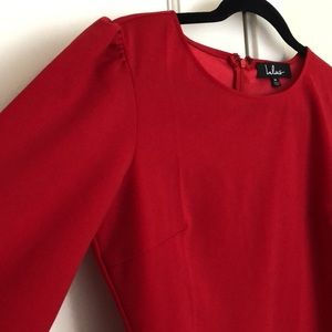 cocktail dress with high, rounded neckline and a darted bodice, framed by long sleeves with gathered and puffed shoulders, all formed by slightly stretchy crepe woven fabric. Figure-skimming mini skirt has a sexy side slit, accented with a bit of ruching. Hidden back zipper/clasp.