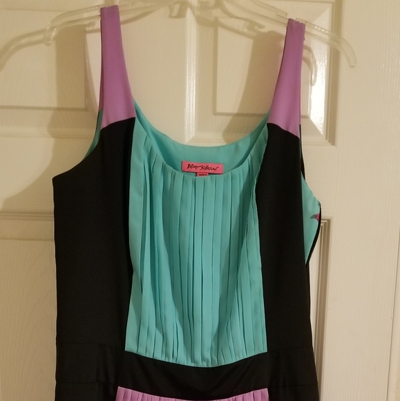 This Slightly Hi-Lo dress is a Perfectly Pleated Party dress.. Navy Blue surprisingly compliments the light purple and mint green. THE skirt is lined, and the side zipper is invisible. It is 100% polyester. The front is 36 inches, the back is 39 inches. I wore this dress once, before I realized it was not for me.. there are some minor makeup stains on the inside front which the cleaners could not remove...hence the low price of dress.