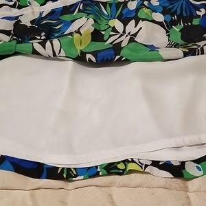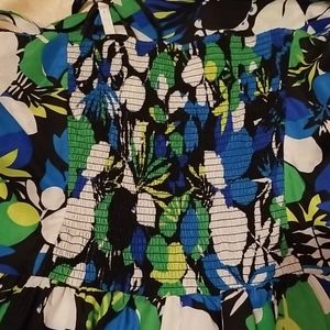 Beautiful summer dress. It has black and white along with two shades of green and blue. There are spaghetti straps, and a stretch panel in the back..Easy breezy slip on with the invisible plside zipper. It is 52% Silk, 48% Cotton and the skirt is lined. It has been dry cleaned and ready to go.