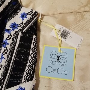 Beautiful day dress in BLack Blue and White. The pleats are WIDE, and the skirt has pockets..there is an invisible zipper in the back. It is 96% Polyester and 4% Spandex..It is 36 in long, NEVER been worn, in perfect condition and ready to go.
