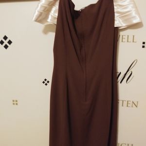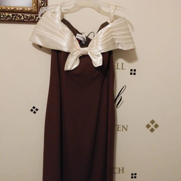 This is an elegant brown and beige dress made out of polyester and satin polyester on the dress and satin around the collar with a bow.
