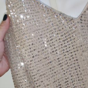 Champagne color more like a light beige color. It has sequins all over. Worn only once. It's very comfortable and light weight.