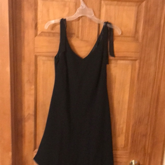 Black multi layered v neck with sheer ties at shoulders, asymmetric bottom