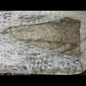 This is a wow wow dress lol. If you are celebrating a birthday, engagement ,anniversary or any big celebration it will be perfect. This dress was made with ostrich feathers. It’s a size small and may fit a medium. It can also be adjusted to an xs if necessary. I love this dress so much, in no rush to sell. Paid $1800 and never regretted it.