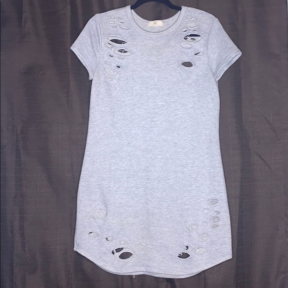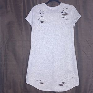 Grey dress with holes purposely placed throughout before purchasing. Distressed look. Only worn once. No stains, rips, or tears.