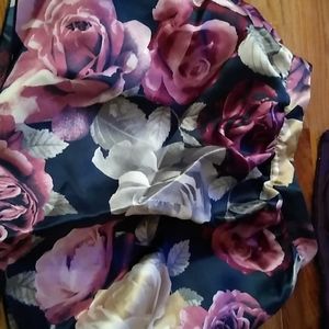 Burgandy, no sleeve, sparkly top w zipper closure. Flowerd short skirt.