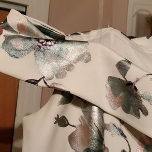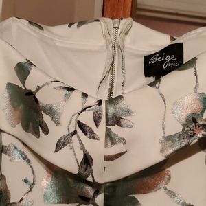 White with green and silver metallic flowers. Off shoulder and zips