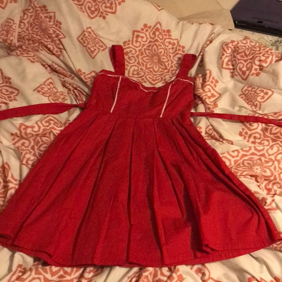 Red dress with two straps tie string in the back heart shape front cut away it’s white border trimming flowing down mid length