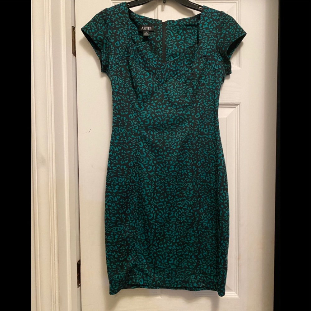 Cute jade and black printed sheath styled dress. It has a sweetheart s Kline and cap sleeves. This dress is too cute and comfy. Nice enough for work, church, or formal event. It is a size 5 by A. Byer. .