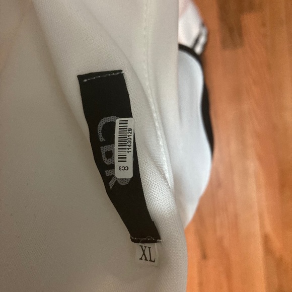 Black and white One sleeve off to the shoulder . It’s Tight fitted. Mermaid style. The link is just a little bit below the knees.