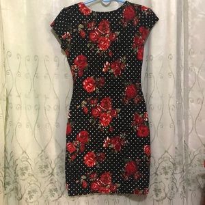 black dress with red flowers and white dots