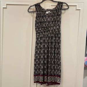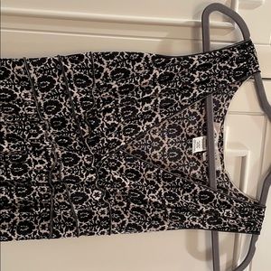 Black and white print, with green and purple on bottom. Thin, stretchy material. V-neck.
